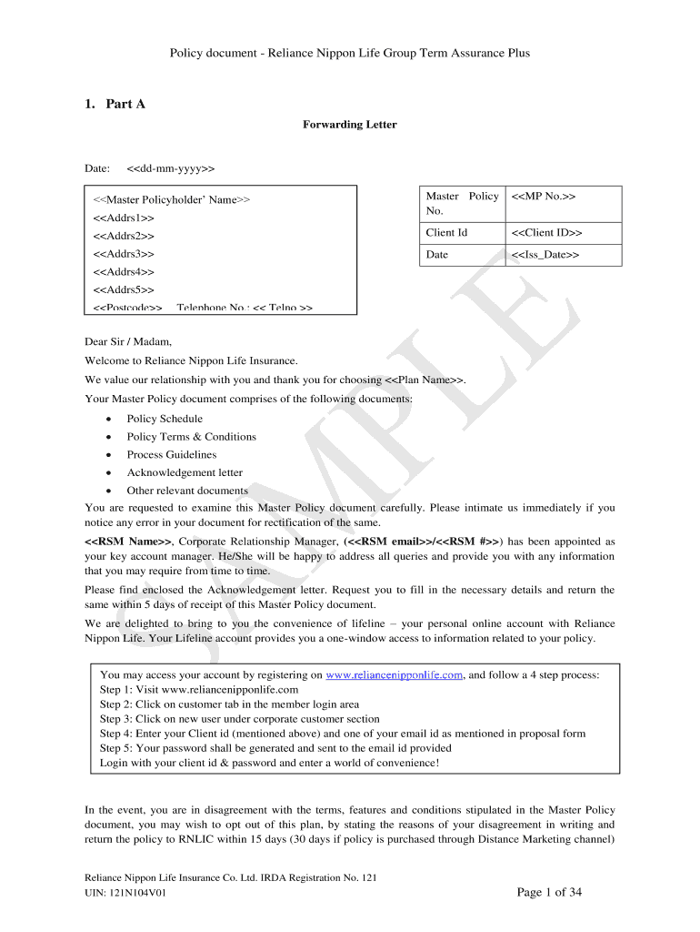 Policy document Reliance Nippon Life Group Term Assurance Plus1. Part A Forwarding Littermate:ddmmyyyy Master Policy No. MP No. Addrs2Client Client IDAddrs3DateIss Date Master Policyholder Name Addrs1Addrs4