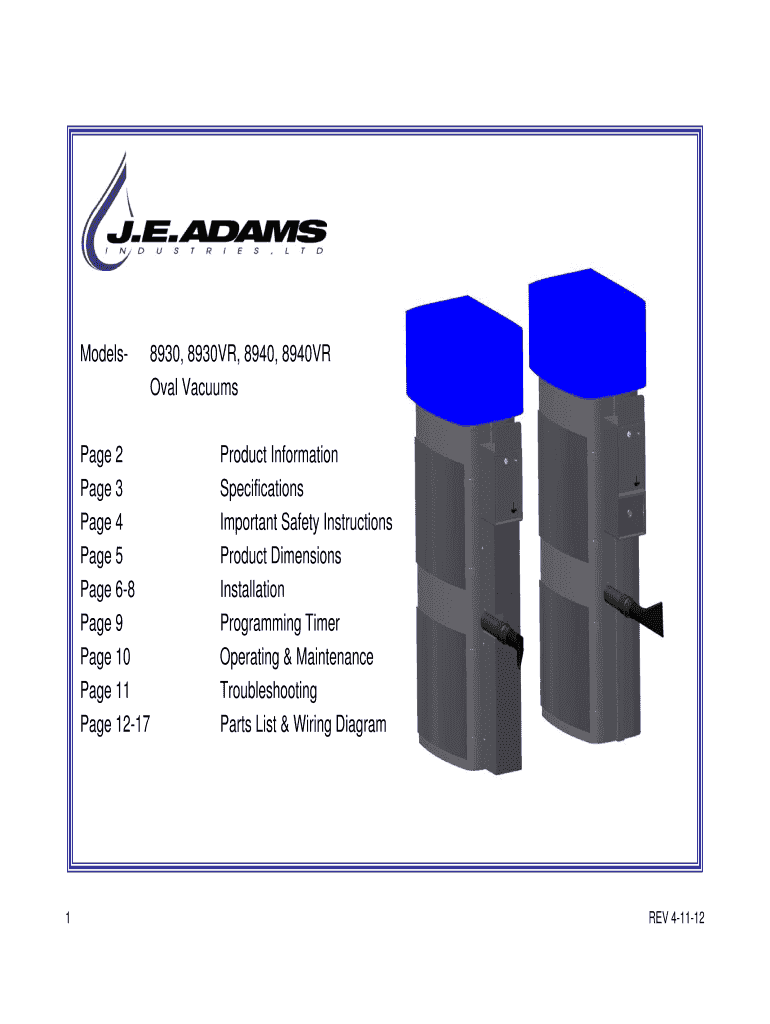 Models8930, 8930VR, 8940, 8940VR Oval Vacuums Page 2-Page 3-Page 4-Page 5-Page 68-Page 9-Page 10-Page 11 Page 12171Product Information Specifications Important Safety Instructions Product Dimensions