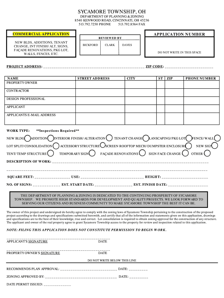 SYCAMORE TOWNSHIP, DEPARTMENT OF PLANNING & ZONING 8540 KENWOOD ROAD, CINCINNATI, OH 45236 513.792.7250 PHONE 513.792.8564 COMMERCIAL APPLICATIONAPPLICATION NUMBERREVIEWED BYN EW BEDS, ADDITIONS,