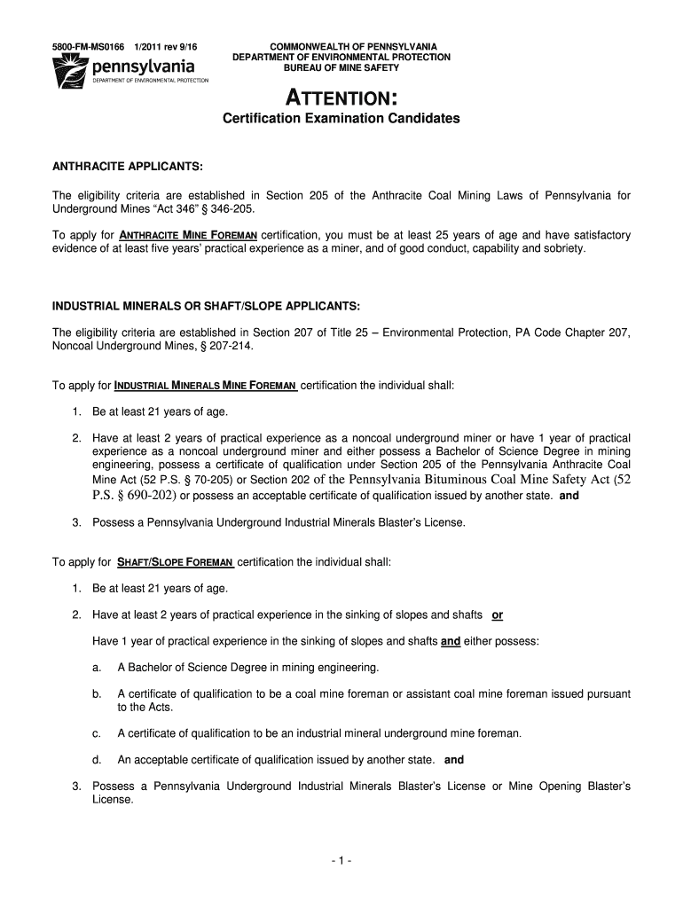 5800FMMS01661/2011 rev 9/16COMMONWEALTH OF PENNSYLVANIA DEPARTMENT OF ENVIRONMENTAL PROTECTION BUREAU OF MINE SAFETYATTENTION: Certification Examination CandidatesANTHRACITE APPLICANTS: The eligibility