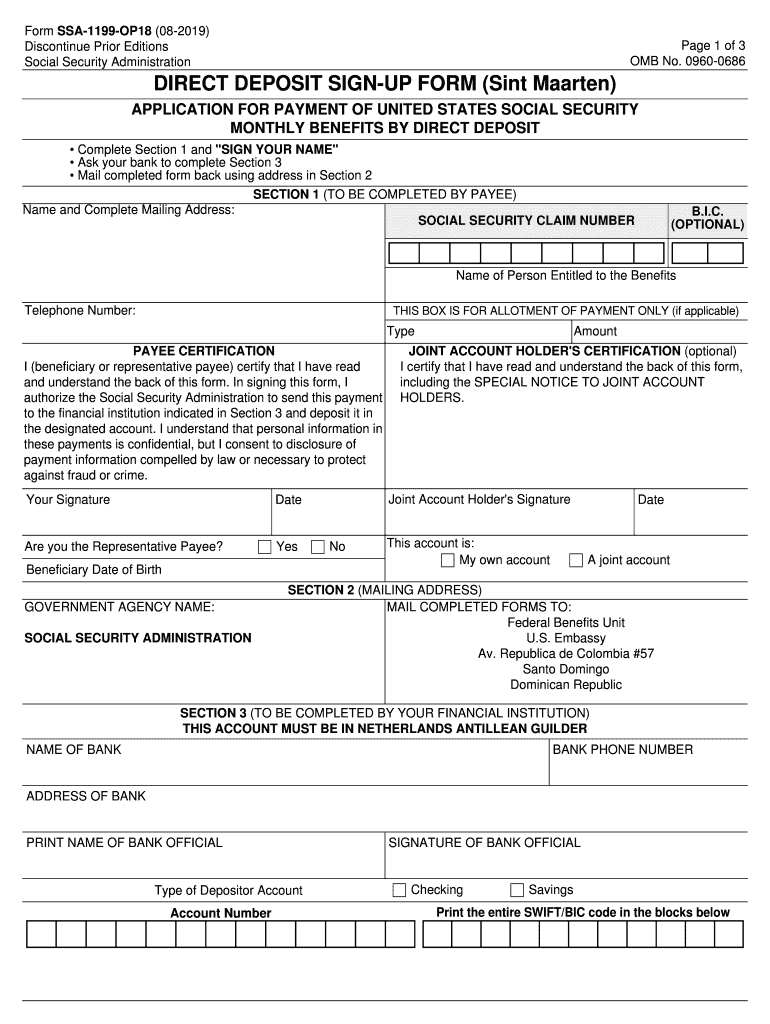 Form SSA1199OP18 (082019) Discontinue Prior Editions Social Security Administration Page 1 of 3 OMB No. 09600686DIRECT DEPOSIT SIGN UP FORM (Sint Maarten) APPLICATION FOR PAYMENT OF UNITED STATES