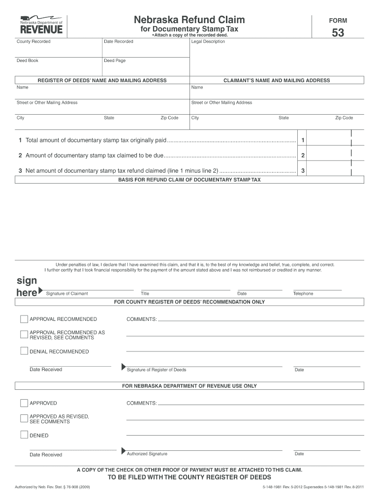 PRINT RESET Nebraska Refund Claim FORM for Documentary Stamp Tax County Recorded Deed Book Attach a copy of the recorded deed* Legal Description Date Recorded Deed Page REGISTER OF DEEDS NAME AND MAILING ADDRESS CLAIMANT S NAME AND MAILING ADDRESS Name Street or Other Mailing Address City State Zip Code 1 Total amount of documentary stamp tax originally paid*. 1 2 Amount of documentary stamp tax claimed to be due. 2 3 Net amount of documentary stamp tax refund claimed line 1 minus line 2....