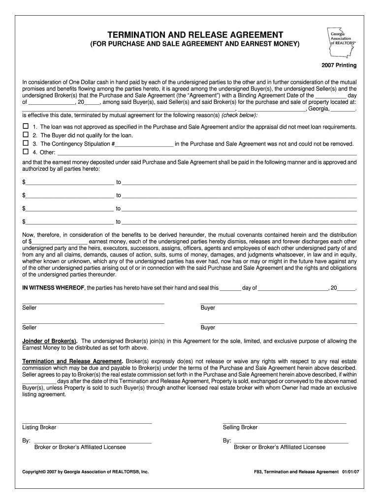 Print TERMINATION AND RELEASE AGREEMENT (FOR PURCHASE AND SALE AGREEMENT AND EARNEST MONEY) 2007 Printing In consideration of One Dollar cash in hand paid by each of the undersigned parties to the
