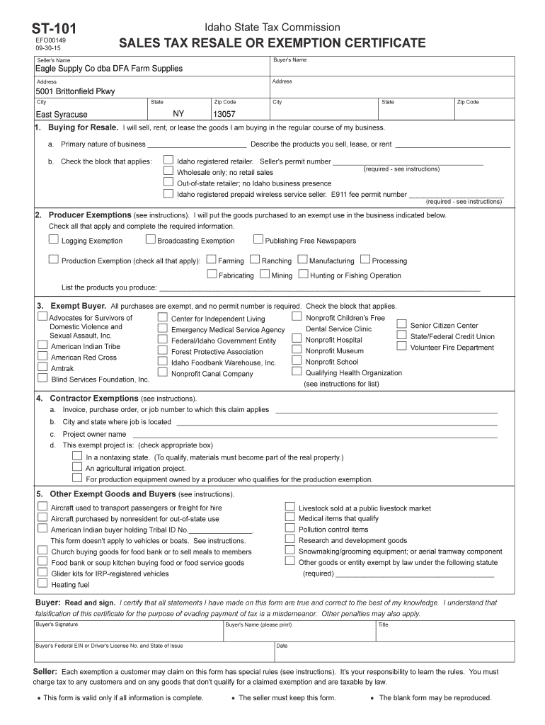 ST101Idaho State Tax Commissionaires TAX RESALE OR EXEMPTION CERTIFICATEEFO00149 093015Buyer's Nameserver's Nameable Supply Co DBA DFA Farm Supplies AddressAddress5001 Brittonfield Pkwy CityStateEast