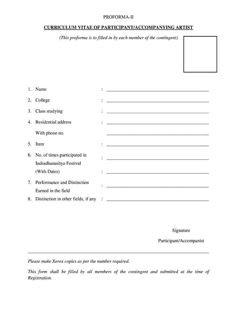 PROFORMA CURRICULUM VITAE OF PARTICIPANT/ACCOMPANYING ARTIST (This proforma is too filled in by each member of the contingent)1. Name: 2. College: 3. Class studying: 4. Residential address: With phone