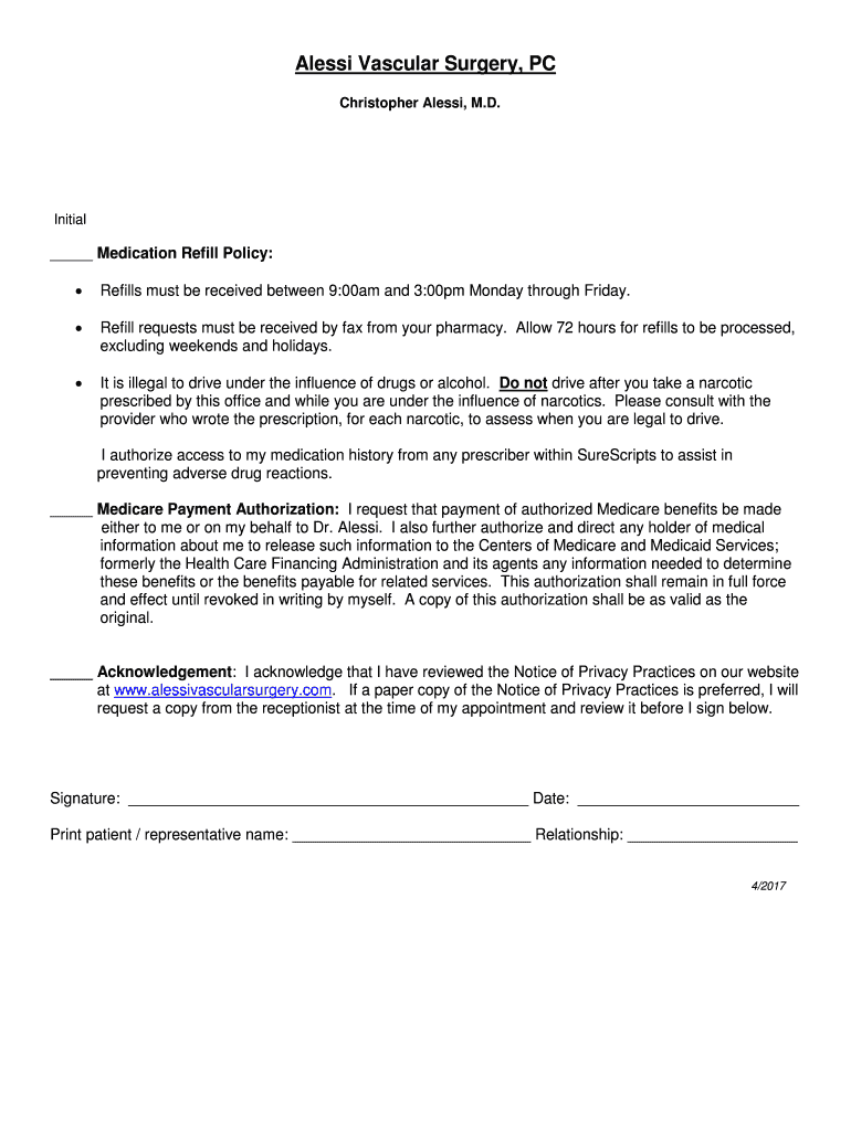 Alessia Vascular Surgery, PC Christopher Alessia, M.D. Initial Medication Refill Policy: Refills must be received between 9:00am and 3:00pm Monday through Friday. Refill requests must be received