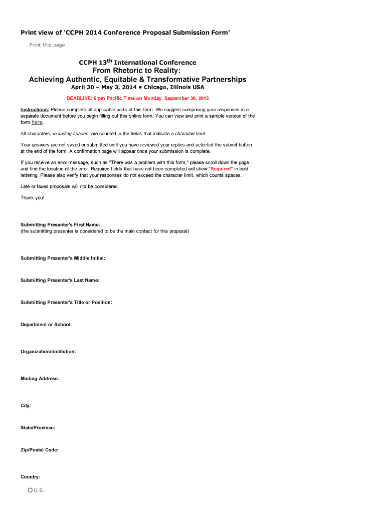 Printviewof 'CCPH2014ConferenceProposalSubmissionForm PrintthispageCCPH13thInternationalConferenceFromRhetorictoReality: AchievingAuthentic, Equitable&TransformativePartnerships April30May3,2014Chicago,Illinois
