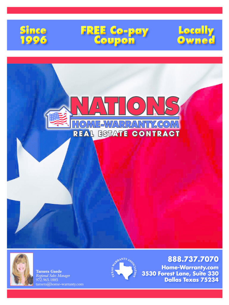 Since 1996FREE Copay CouponLocally OwnedTEANTY ASSIATION1RROCTamera Made Regional Sales Manager 972.965.1885 Tamera home warranty. Come AS W AREAL ESTATE CONTRACT888.737.7070 HomeWarranty.com 3530