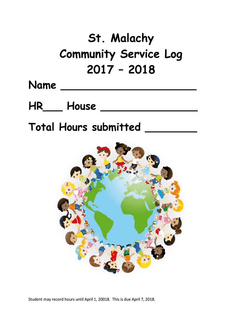St. Malachi Community Service Log 2017 2018 Name HR House Total Hours submitted Student may record hours until April 1, 20018. This is due April 7, 2018. Community Service Journal Service is work