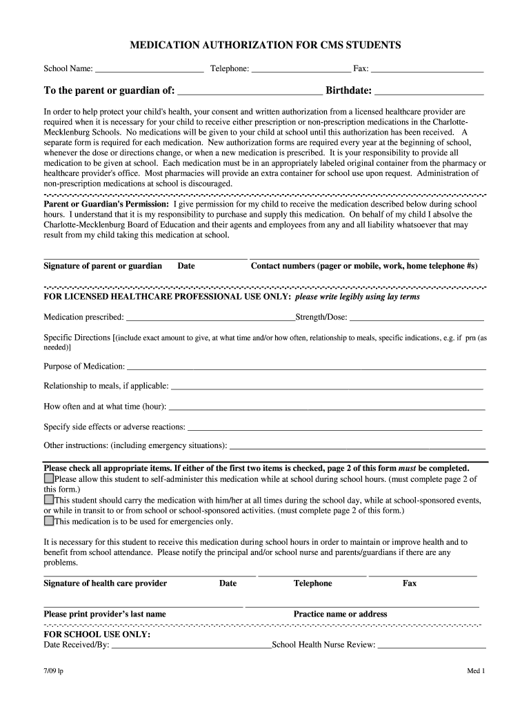 MEDICATION AUTHORIZATION FOR CMS STUDENTS School Name: Telephone: Fax: To the parent or guardian of: Birthdate: In order to help protect your child's health, your consent and written authorization