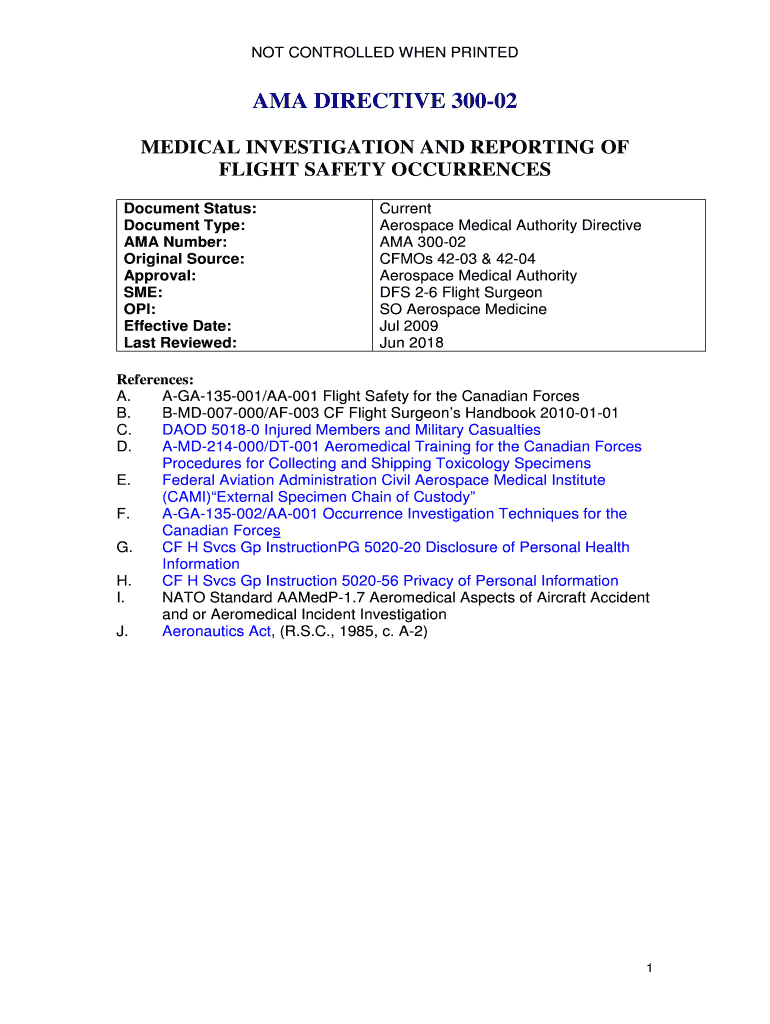NOT CONTROLLED WHEN PRINTED AMA DIRECTIVE 30002 MEDICAL INVESTIGATION AND REPORTING OF FLIGHT SAFETY OCCURRENCES Document Status: Document Type: AMA Number: Original Source: Approval: SME: OPI: Effective