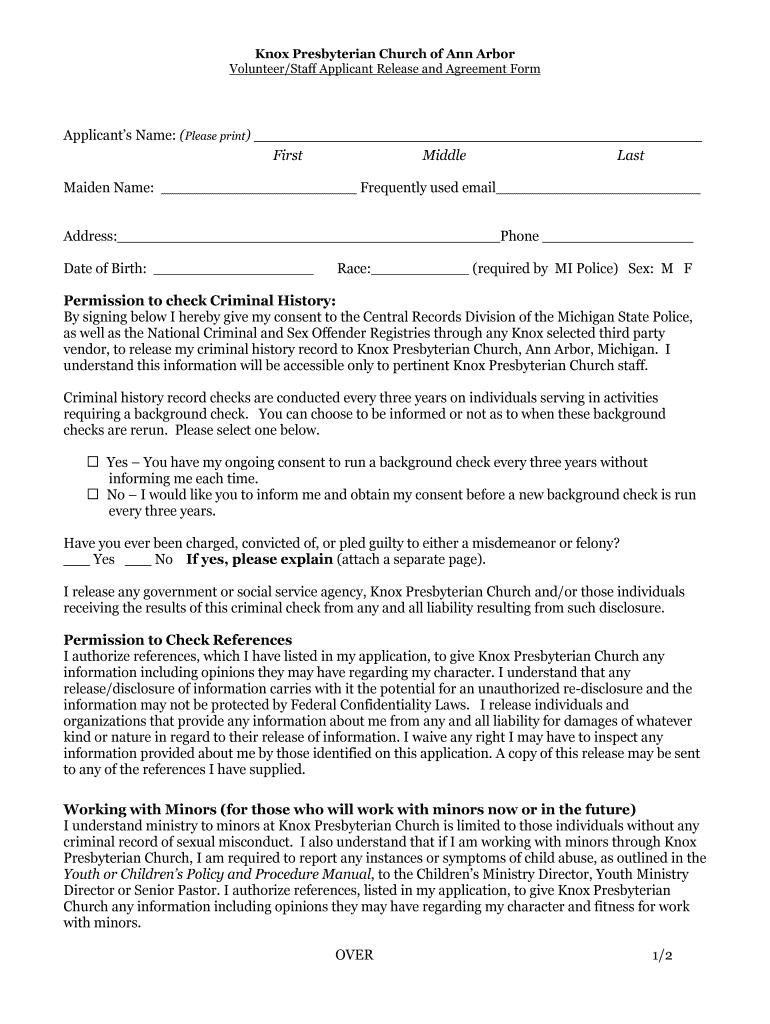 Knox Presbyterian Church of Ann Arbor Volunteer/Staff Applicant Release and Agreement FormApplicants Name: (Please print) First Middle Last Maiden Name: Frequently used email Address: Phone Date of