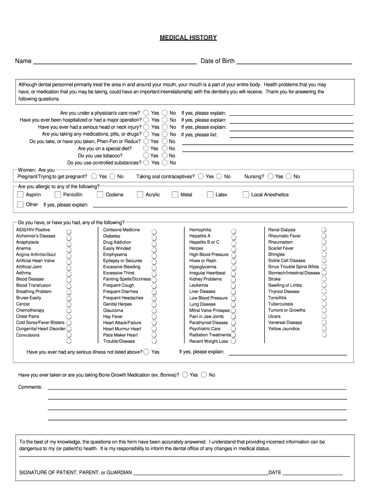 William Keith Crummy, D.M.D. MEDICAL HISTORY Name Date of Birth Although dental personnel primarily treat the area in and around your mouth, your mouth is a part of your entire body. Health problems