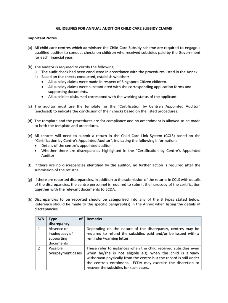 GUIDELINES FOR ANNUAL AUDIT ON CHILD CARE SUBSIDY CLAIMS Important Notes (a) All child care centers which administer the Child Care Subsidy scheme are required to engage a qualified auditor to conduct