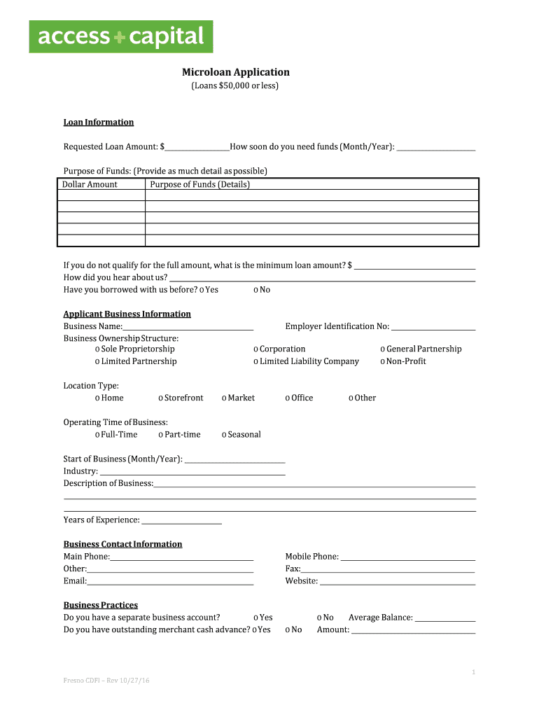 Microloan Application(Loans $50,000 or less)Loan InformationRequested Loan Amount: show soon do you need funds (Month/Year):Purpose of Funds: (Provide as much detail as possible)Dollar AmountPurpose