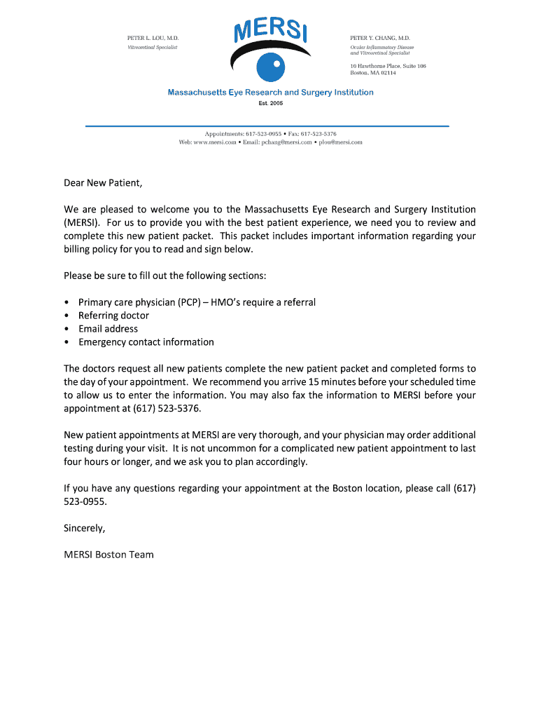 Dear New Patient, We are pleased to welcome you to the Massachusetts Eye Research and Surgery Institution (ME RSI). For us to provide you with the best patient experience, we need you to review and