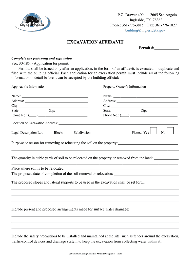 P.O. Drawer 400 2665 San Angelo Inside, TX 78362 Phone: 3617763815 Fax: 3617761027 building inglesidetx. Excavation AFFIDAVIT Permit #: Complete the following and sign below: Sec. 30185. Application