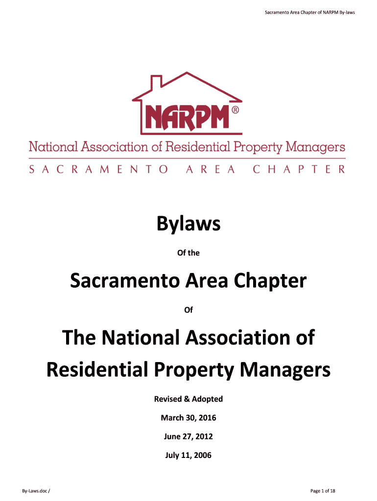 Sacramento Area Chapter of ARM BylawsBylaws Of the Sacramento Area Chapter Of the National Association of Residential Property Managers Revised & Adopted March 30, 2016, June 27, 2012, July 11, 2006ByLaws.doc