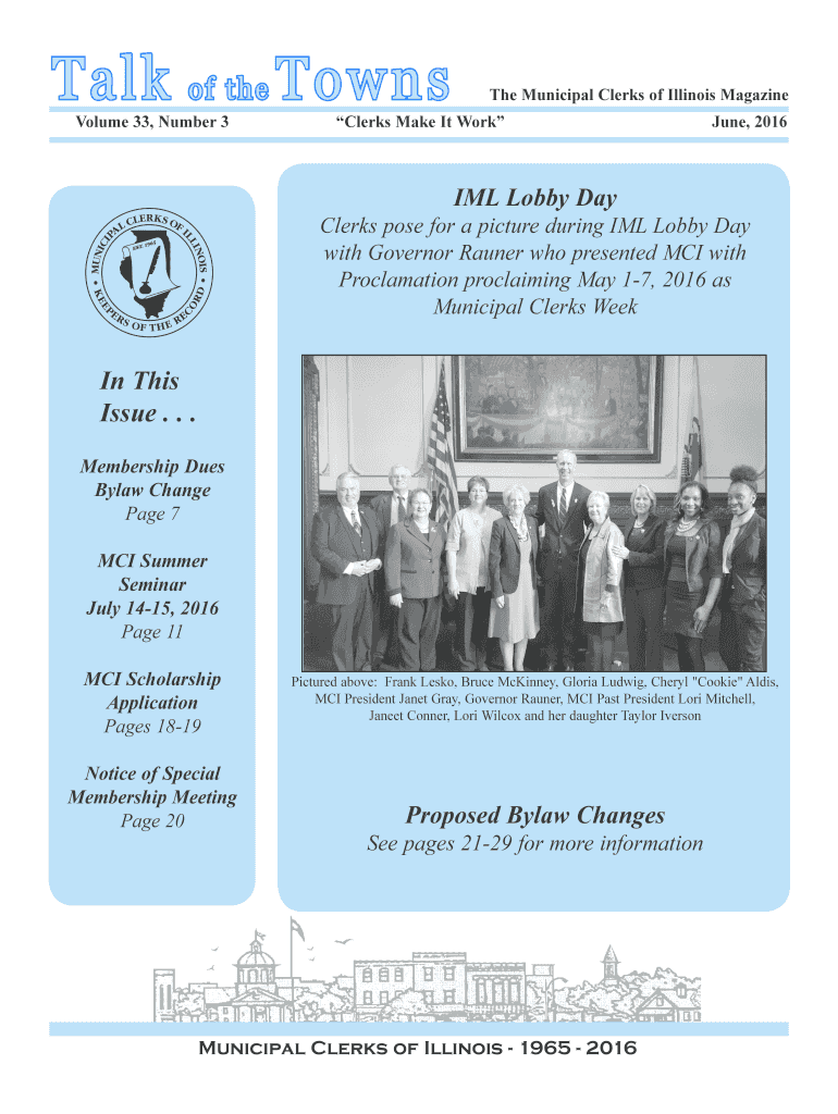 Talk of volume 33, Number 3TownsThe Municipal Clerks of Illinois MagazineClerks Make It Work June, 2016IML Lobby Dancers pose for a picture during ILL Lobby Day
