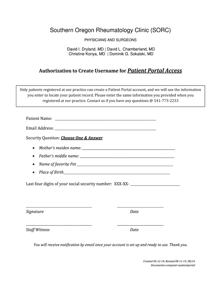 Southern Oregon Rheumatology Clinic (SORT) PHYSICIANS AND SURGEONS David I. Dryland, MD David L. Chamber land, MD Christine Kenya, MD Dominik G. Kowalski, Authorization to Create Username for Patient