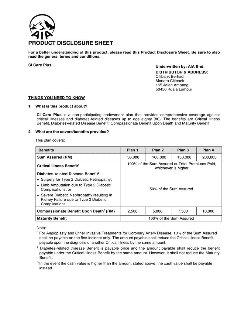 PRODUCT DISCLOSURE SHEET For a better understanding of this product, please read this Product Disclosure Sheet. Be sure to also read the general terms and conditions. CI Care PlusUnderwritten by: