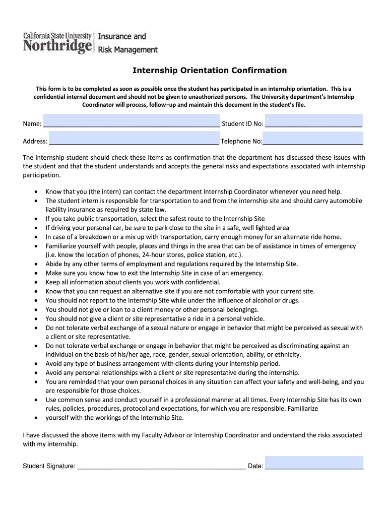 Internship Orientation Confirmation This form is to be completed as soon as possible once the student has participated in an internship orientation. This is a confidential internal document and should