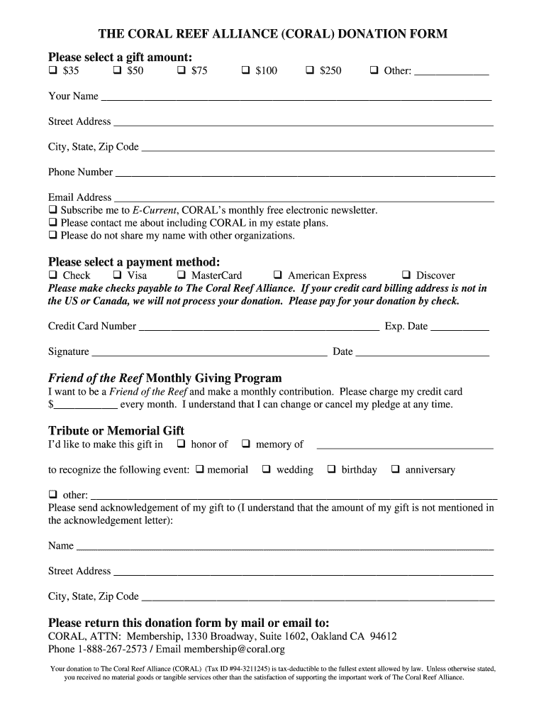 THE CORAL REEF ALLIANCE (CORAL) DONATION FORM Please select a gift amount: $35 ×50 ×75 ×100 ×250 Other: Your Name Street Address City, State, Zip Code Phone Number Email Address Subscribe me to