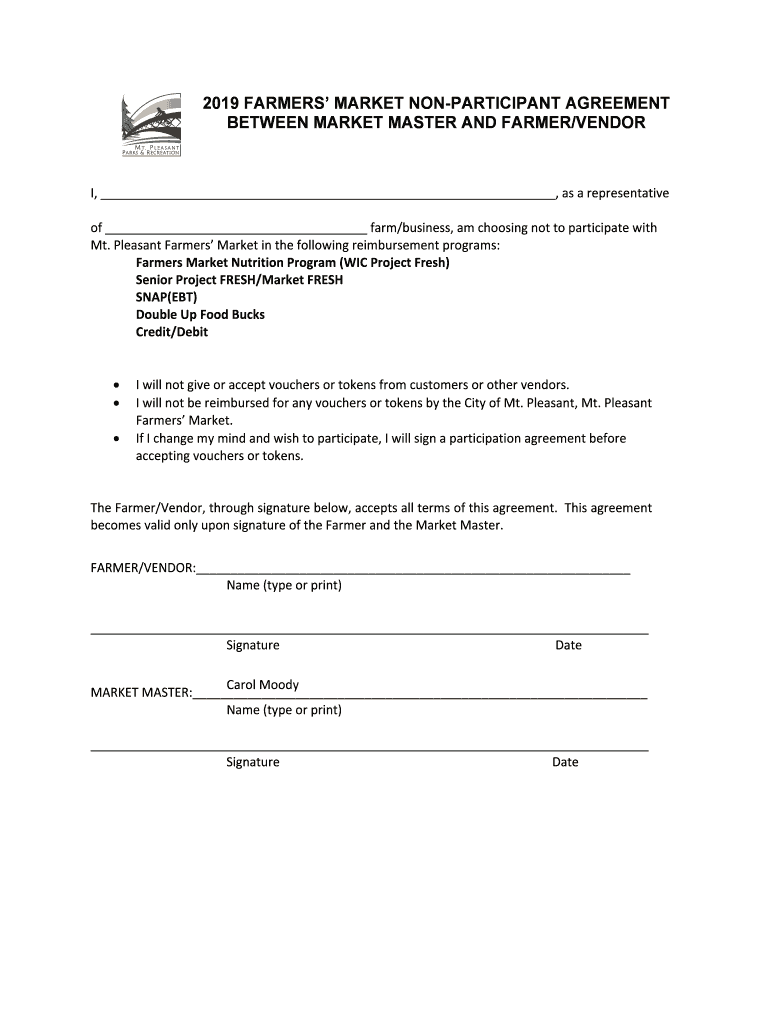 2019 FARMERS MARKET NONPARTICIPANT AGREEMENT BETWEEN MARKET MASTER AND FARMER/VENDOR I, representative of farm/business, amchoosingnottoparticipatewith Mt. PleasantFarmersMarketinthefollowingreimbursementprograms: