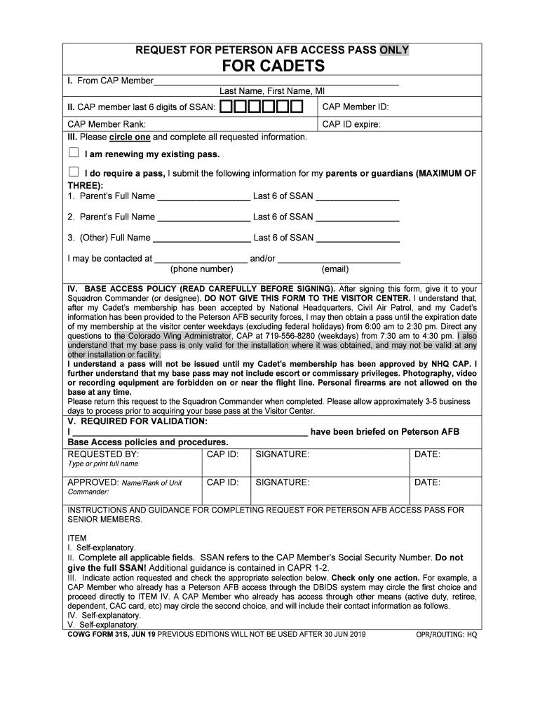 REQUEST FOR PETERSON AFB ACCESS PASS ONLY CADETS I. From CAP Member Last Name, First Name, MI II. CAP member last 6 digits of SAN:CAP Member Rank: III. Please circle one and complete all requested