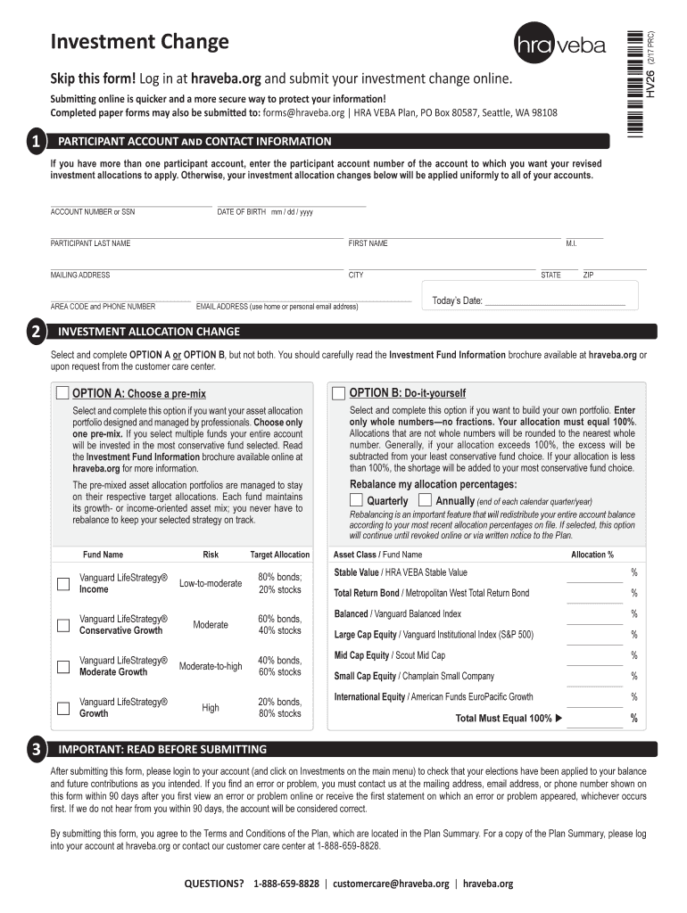 (2/17 PRC)Investment Change Skip this form! Log in at have.org and submit your investment change online. Submitting online is quicker and a more secure way to protect your information! Completed paper