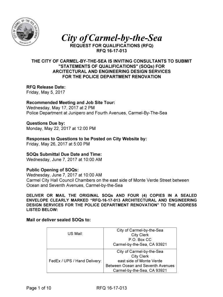 City of CarmelbytheSea REQUEST FOR QUALIFICATIONS (RFQ) RFQ 1617013 THE CITY OF CARMELBYTHESEA IS INVITING CONSULTANTS TO SUBMIT “STATEMENTS OF QUALIFICATIONS (Sons) FOR ARCHITECTURAL AND ENGINEERING