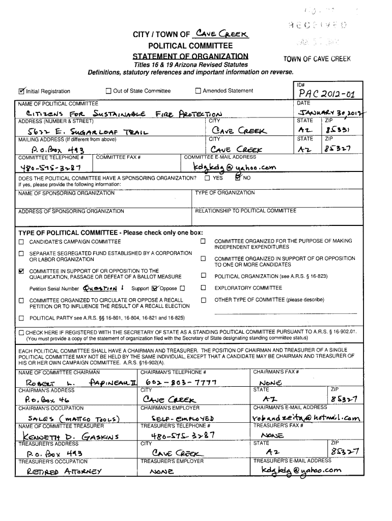 CITY! TOWN OF CA OF Cs. Eek, POLITICAL COMMITTEE STATEMENT OF ORGANIZATION TOWN OF CAVE CREEK Titles 16 & 19 Arizona Revised Statutes Definitions, statutory references and important information on