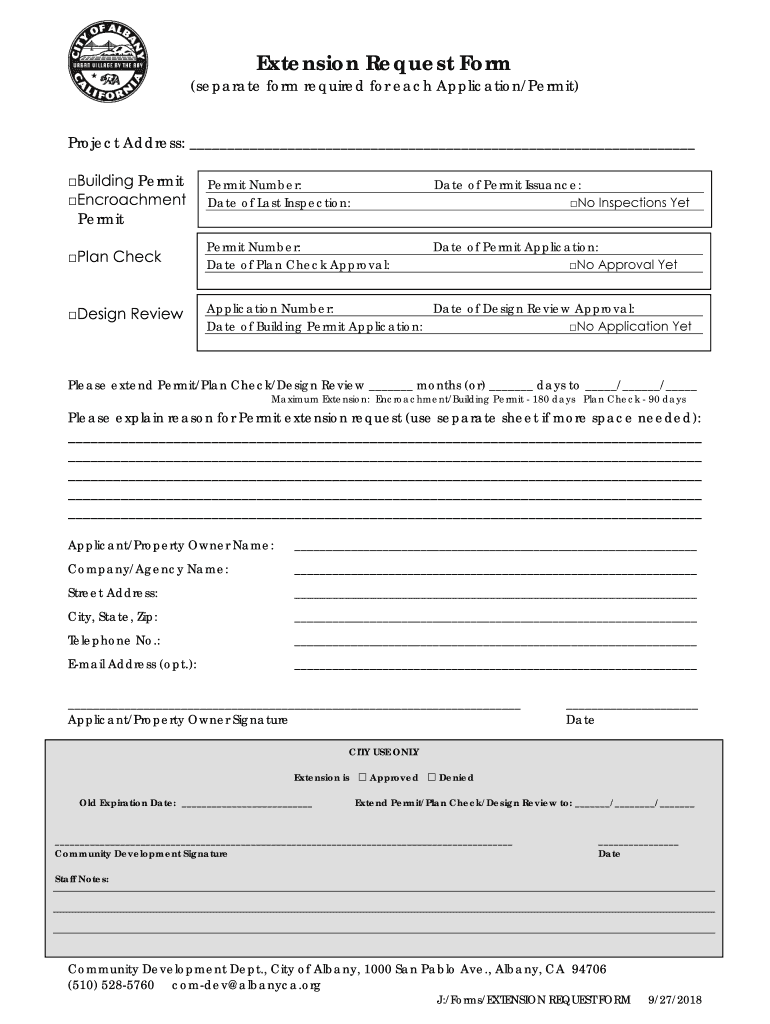 Extension Request Form(separate form required for each Application/Permit) Project Address: Building Permit Encroachment PermitPermit Number: Date of Last Inspection:Date of Permit Issuance: No Inspections