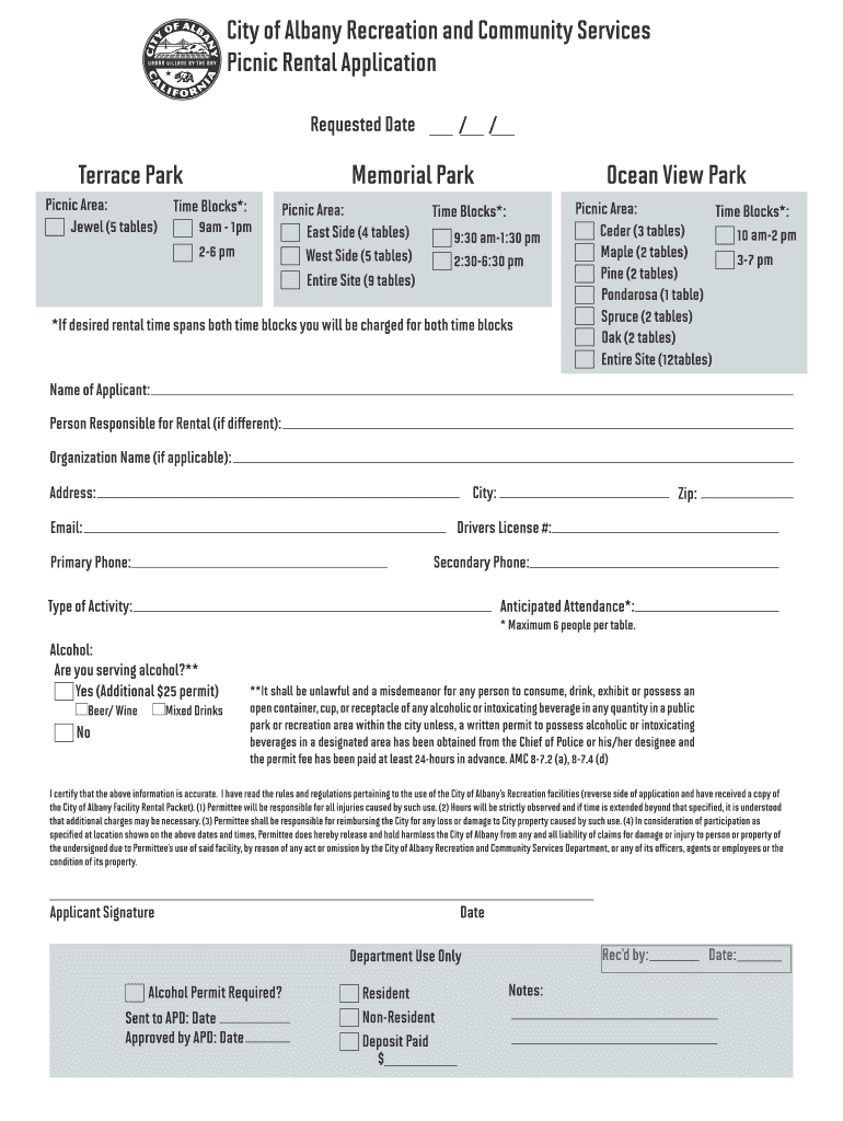 City of Albany Recreation and Community Services Picnic Rental Application Requested DateTerrace Park//Memorial ParkPicnic Area: Time Blocks*: Jewel (5 tables) 9am 1pm 26 picnic Area: East Side (4