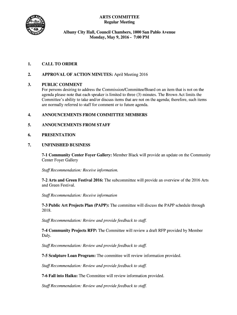 ARTS COMMITTEE Regular Meeting Albany City Hall, Council Chambers, 1000 San Pablo Avenue Monday, May 9, 2016 7:00 PM1.CALL TO ORDER2.APPROVAL OF ACTION MINUTES: April Meeting 20163.PUBLIC COMMENT