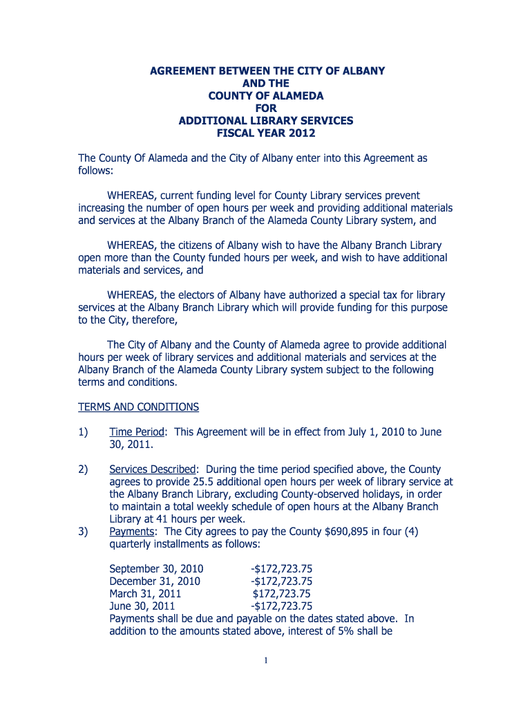 The County Of Alameda and the City of Albany enter into this Agreement as