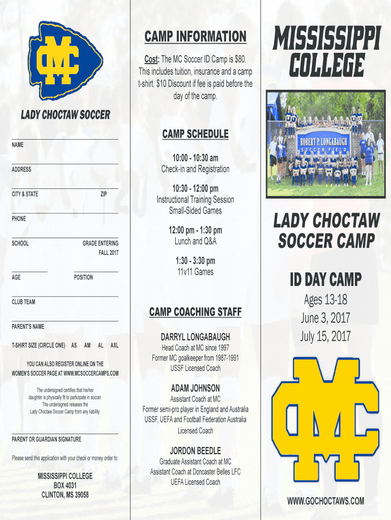 CAMP INFORMATION Cost: The MC Soccer ID Camp is $80. This includes tuition, insurance and a camp shirt. $10 Discount if fee is paid before the day of the camp. MISSISSIPPI COLLEGELADY CHOCTAW SOCCER