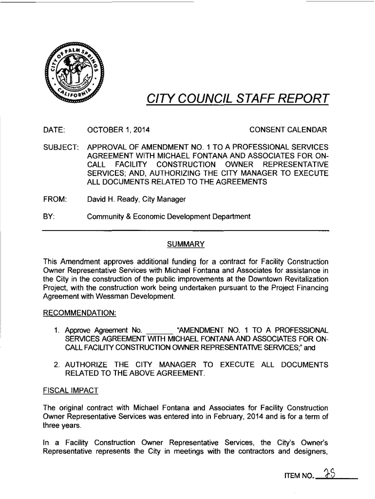 CITY COUNCIL STAFF REPORT DATE:OCTOBER 1, 2014CONSENT CALENDARSUBJECT:APPROVAL OF AMENDMENT NO. 1 TO A PROFESSIONAL SERVICES AGREEMENT WITH MICHAEL FONTANA AND ASSOCIATES FOR CALL FACILITY CONSTRUCTION