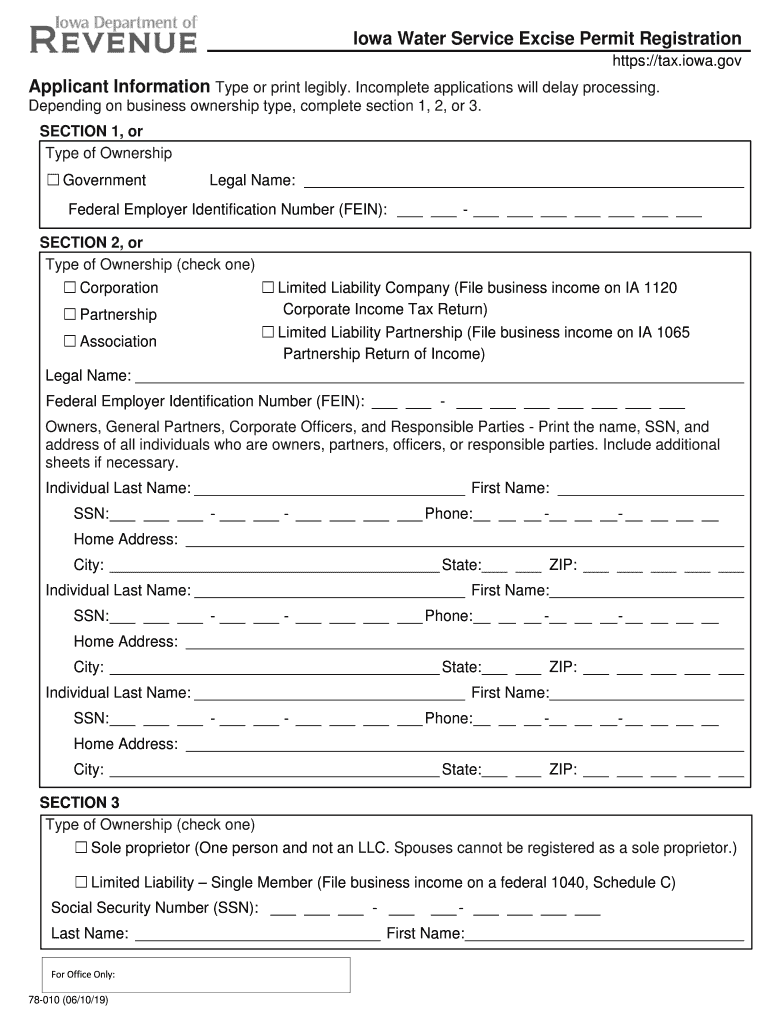 Iowa Water Service Excise Permit Registration https://tax.iowa.govApplicant Information Type or print legibly. Incomplete applications will delay processing. Depending on business ownership type,