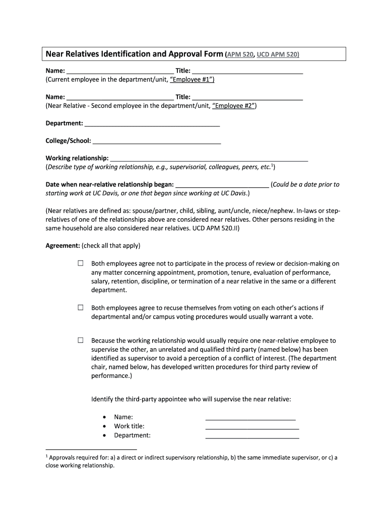 Near Relatives Identification and Approval Form (APM 520, UCD APM 520) Name: Title: (Current employee in the department/unit, Employee #1) Name: Title: (Near Relative Second employee in the department/unit,