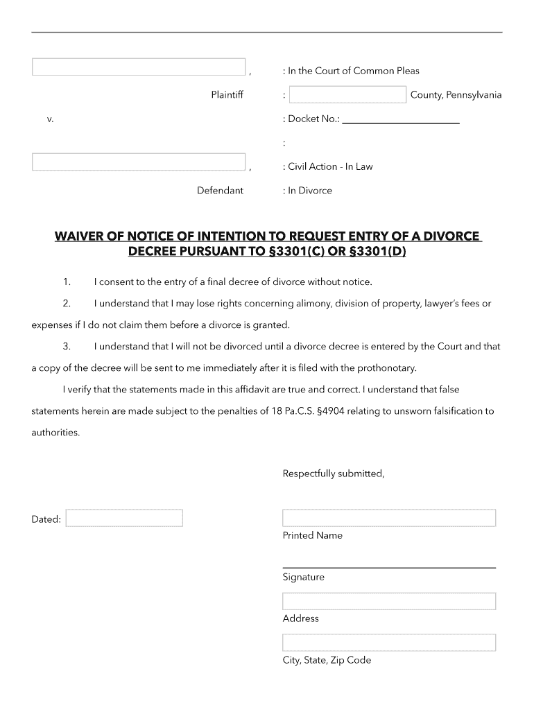 , Plaintiff: In the Court of Common Pleas :County, Pennsylvania.: Docket No.: :, Defendant: Civil Action In Law : In DivorceWAIVER OF NOTICE OF INTENTION TO REQUEST ENTRY OF A DIVORCE DECREE PURSUANT