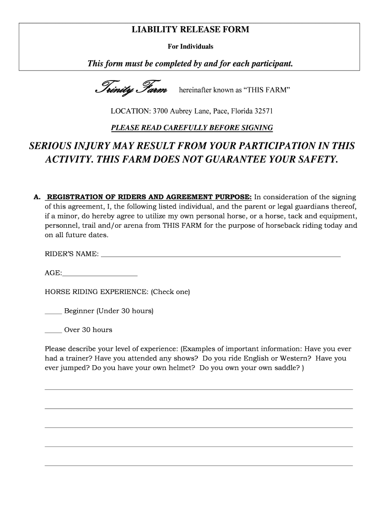 For Individualistic form must be completed by and for each participant. Trinity Farm hereinafter known as THIS ALLOCATION: 3700 Aubrey Lane, Pace, Florida 32571
