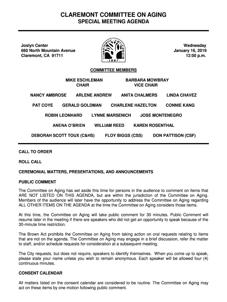 CLAREMONT COMMITTEE ON AGING SPECIAL MEETING AGENDAJoslyn Center 660 North Mountain Avenue Claremont, CA 91711Wednesday January 16, 2019 12:00 p.m.COMMITTEE MEMBERS MIKE COLEMAN CHAIR NANCY AMBROSE