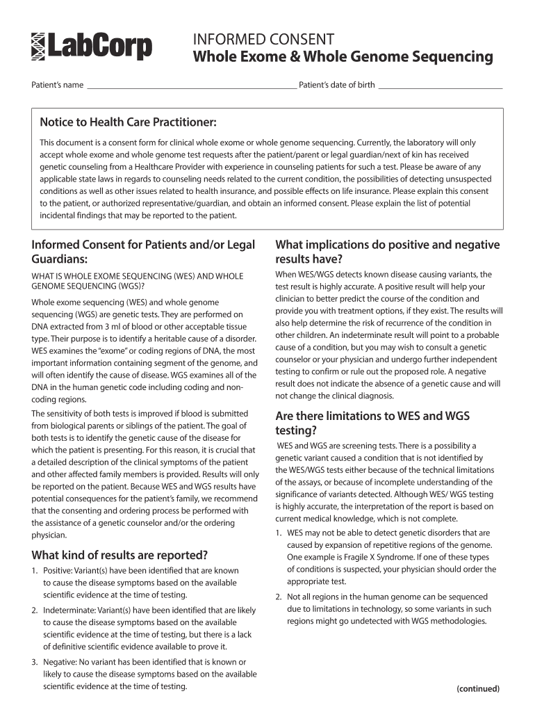 INFORMED CONSENT Wholesome & Whole Genome Sequencing Patients name Patients date of birth Notice to Health Care Practitioner: This document is a consent form for clinical wholesome or whole genome