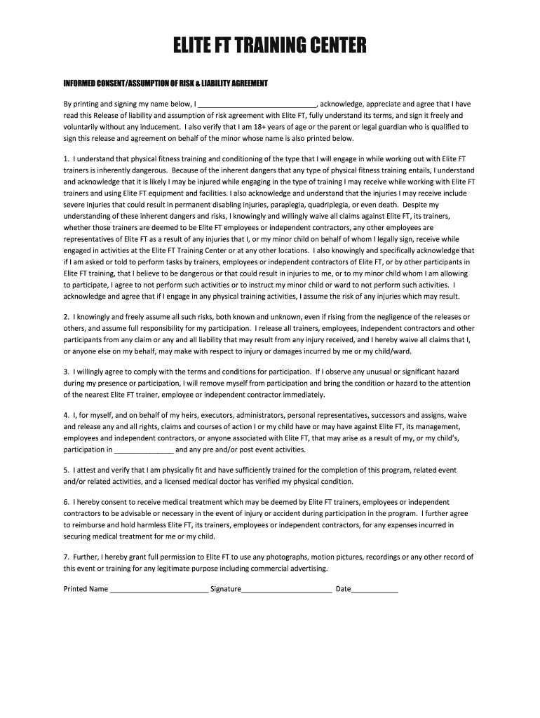 ELITE FT TRAINING CENTER INFORMED CONSENT/ASSUMPTION OF RISK & LIABILITY AGREEMENT By printing and signing my name below, I, acknowledge, appreciate and agree that I have read this Release of liability