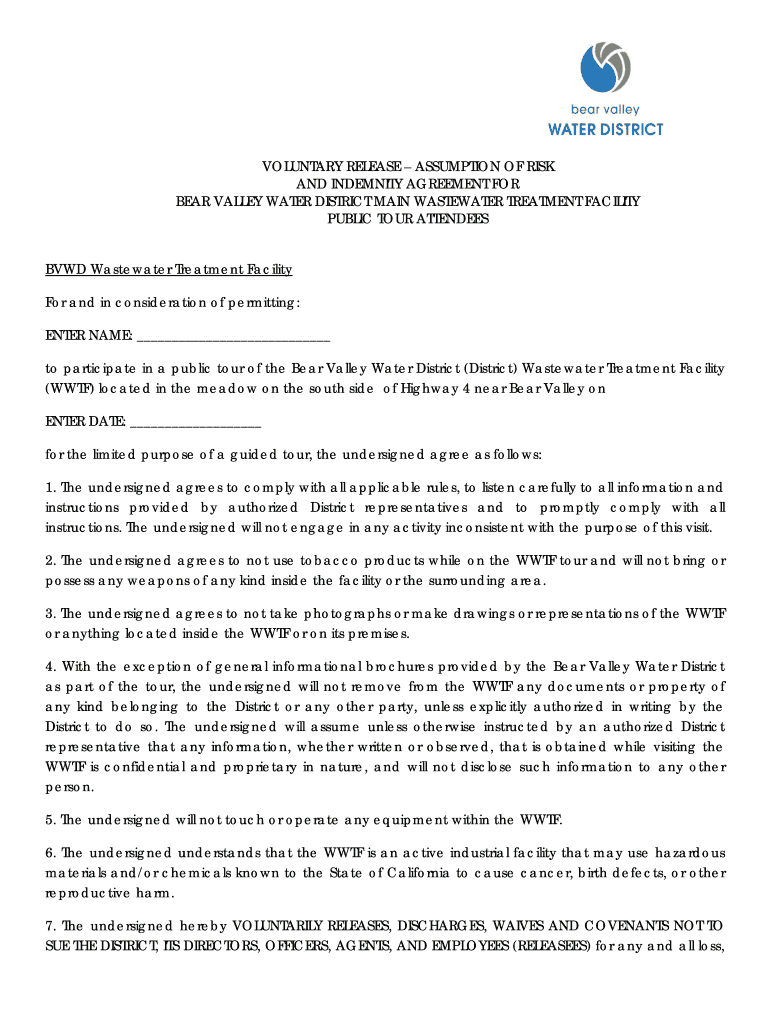 VOLUNTARY RELEASE ASSUMPTION OF RISK AND INDEMNITY AGREEMENT FOR BEAR VALLEY WATER DISTRICT MAIN WASTEWATER TREATMENT FACILITY PUBLIC TOUR ATTENDEES BVD Wastewater Treatment Facility For and in consideration