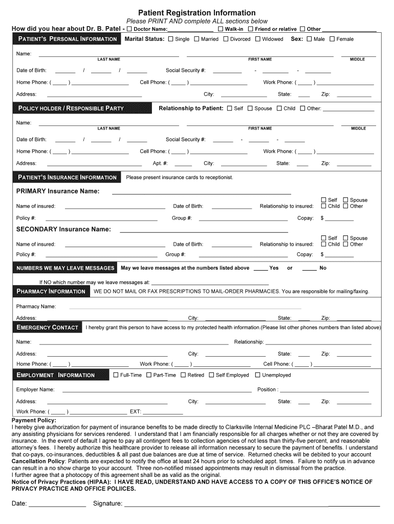 Patient Registration Information Please PRINT AND complete ALL sections below How did you hear about Dr. B. Patel PATIENTS PERSONAL INFORMATION Doctor Name: Marital Status:SingleWalkinMarriedFriend