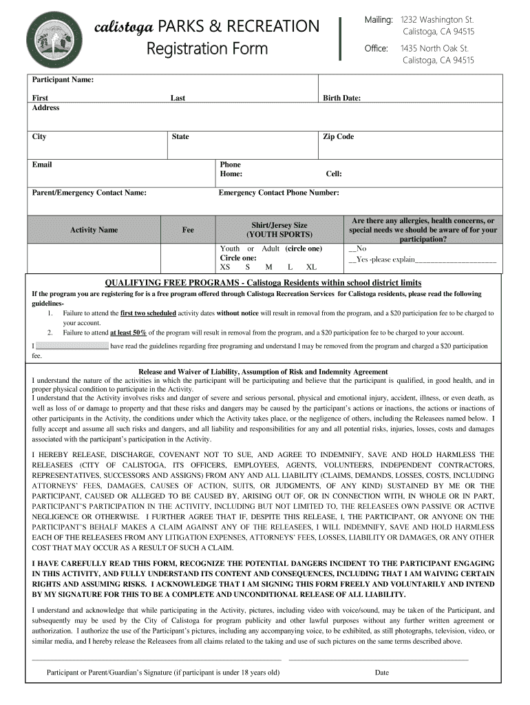Mailing: 1232 Washington St. Callisto, CA 94515calistoga PARKS & RECREATION Registration FormOffice:1435 North Oak St. Callisto, CA 94515Participant Name: First AddressLastBirth Date:CityStateZip
