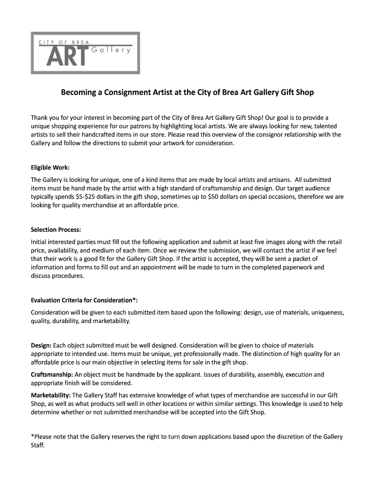 Thank you for your interest in becoming part of the City of Area Art Gallery Gift Shop! Our goal is to provide a