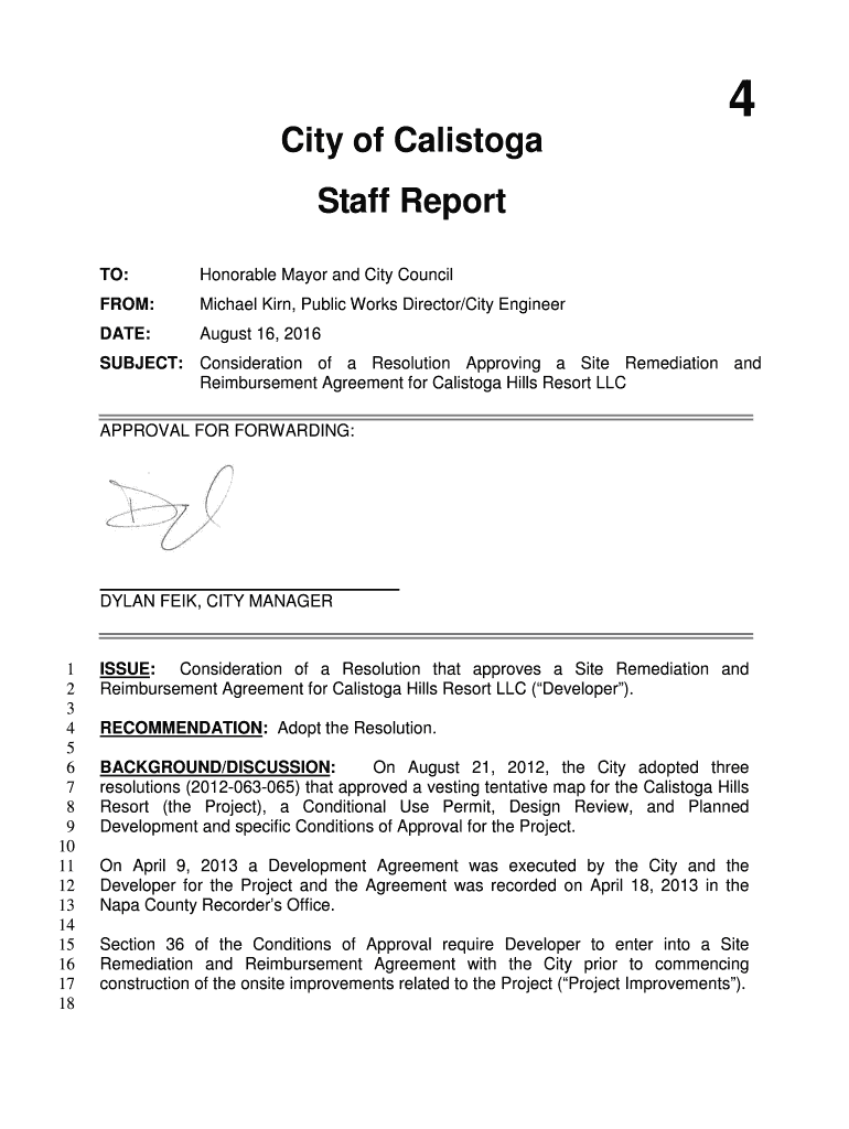 TO:Honorable Mayor and City Councilor:Michael Kirk, Public Works Director/City EngineerDATE:August 16, 2016SUBJECT: Consideration of a Resolution Approving a Site Remediation
